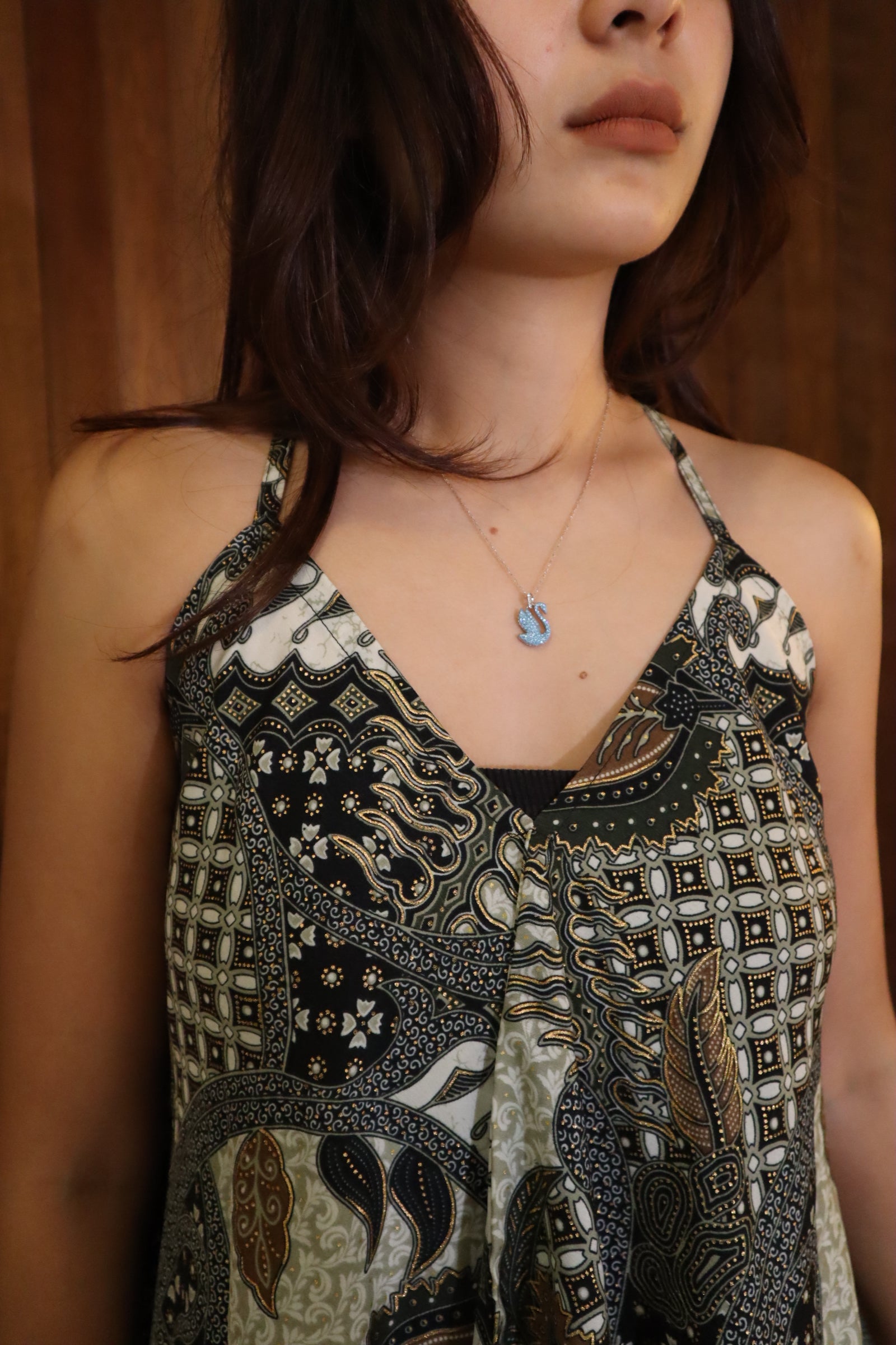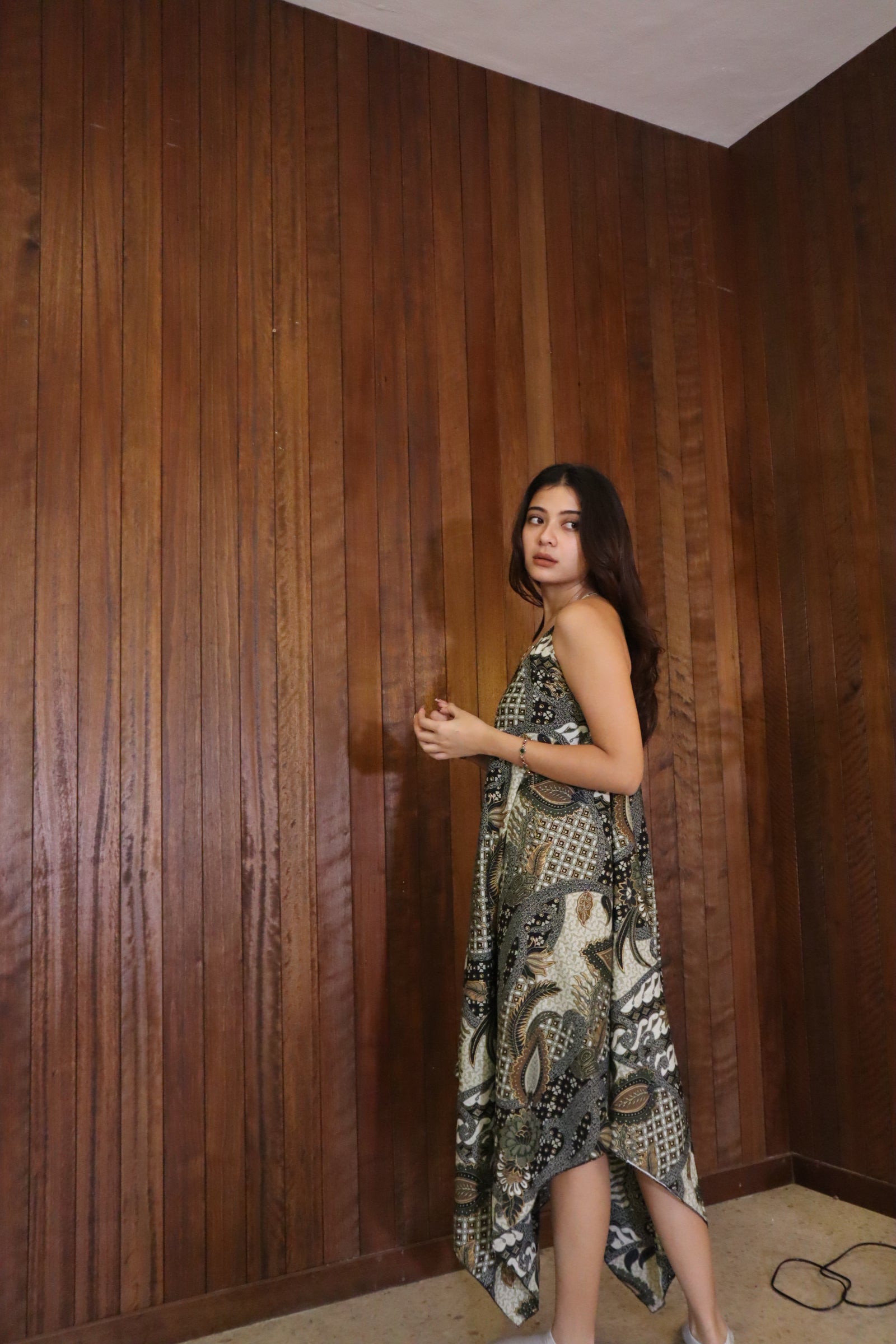 This versatile free-size piece features a chic halter-neck design with thin spaghetti straps, creating an elegant and modern silhouette. The flowing, asymmetrical hem adds movement and a touch of drama to every step. Made from soft, breezy silk polyester, it includes practical side pockets for everyday ease. Proudly Made in Malaysia.
