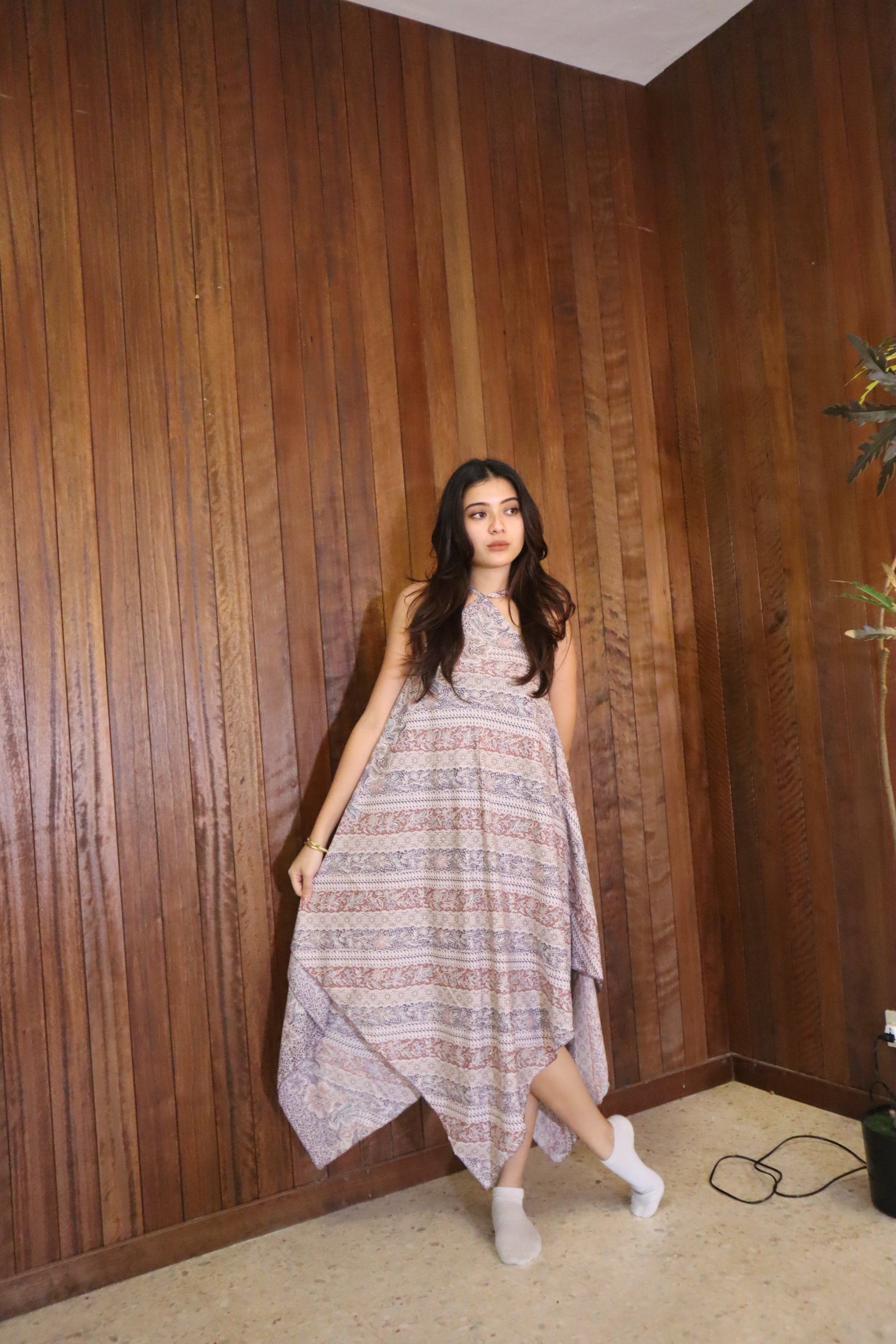 This versatile free-size piece features a chic halter-neck design with thin spaghetti straps, creating an elegant and modern silhouette. The flowing, asymmetrical hem adds movement and a touch of drama to every step. Made from soft, breezy silk polyester, it includes practical side pockets for everyday ease. Proudly Made in Malaysia.